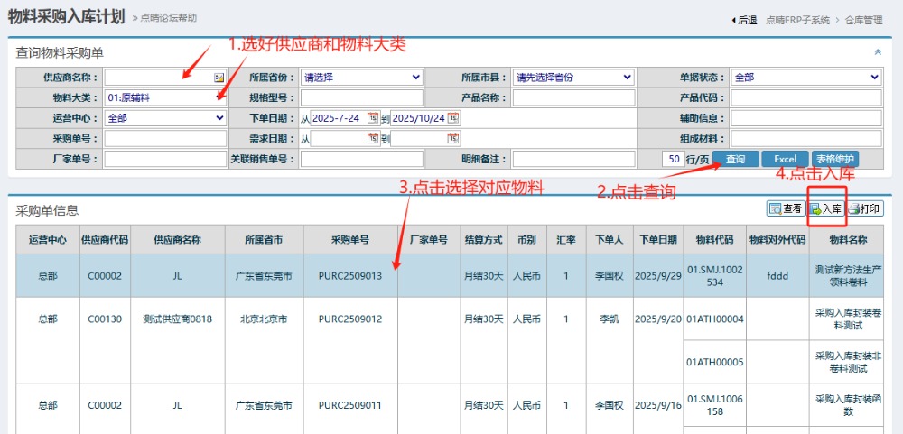 2.进入页面后,按图操作:选好供应商和物料大类,点击查询。然后点击选择对应物料,点击入库。