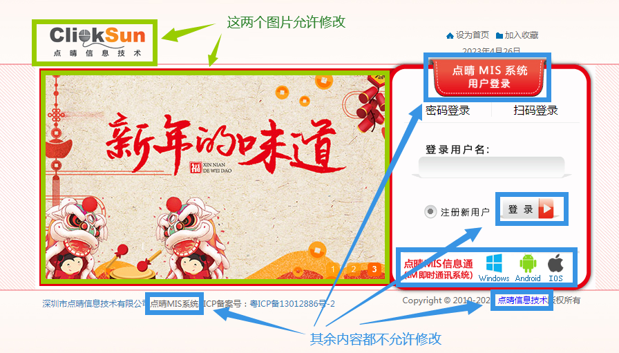 特别说明:登录首页上,除了LOGO和滚动图片之外的其余图片或内容都不允许更改: