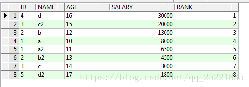 结果:结果中 rank 的序号,其实就表明了 over(order by salary desc) 是在where age between and 后执行的