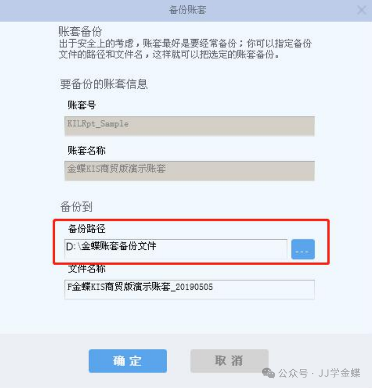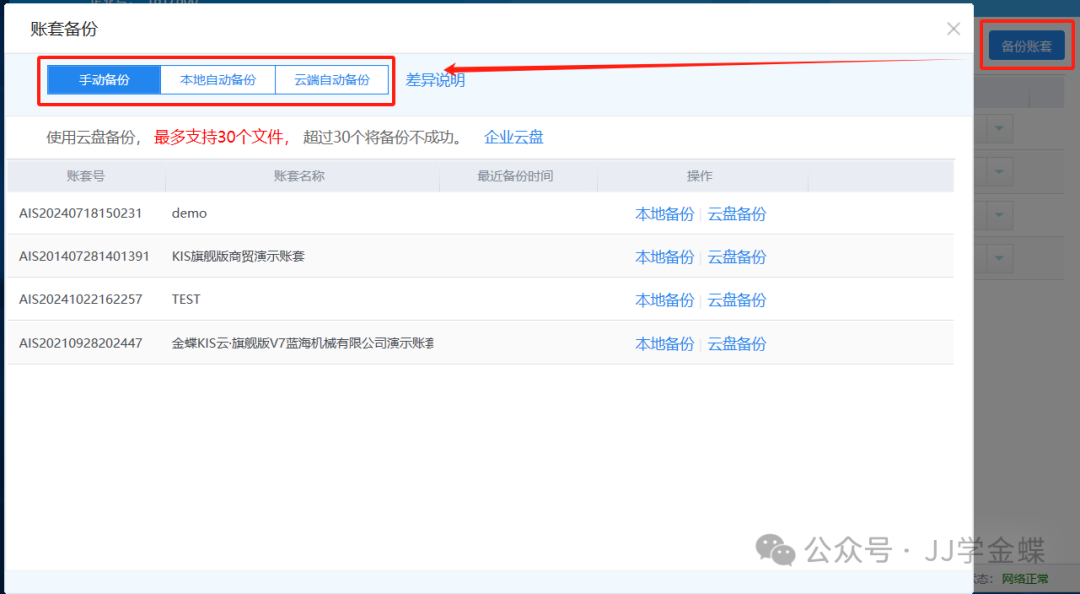 选择备份账套保存位置,建议勾上【备份到企业云盘】,点击【备份】按钮,这样在本地路径和金蝶企业云盘中同时进行备份。