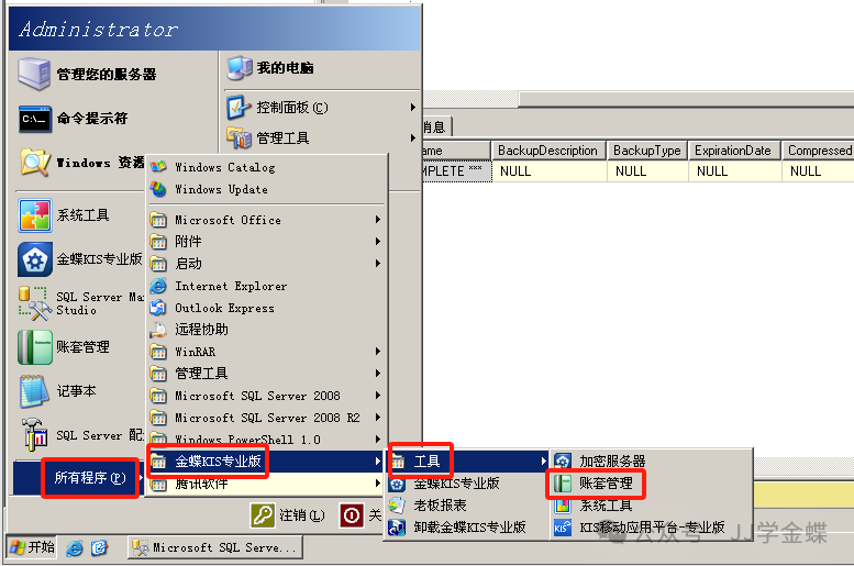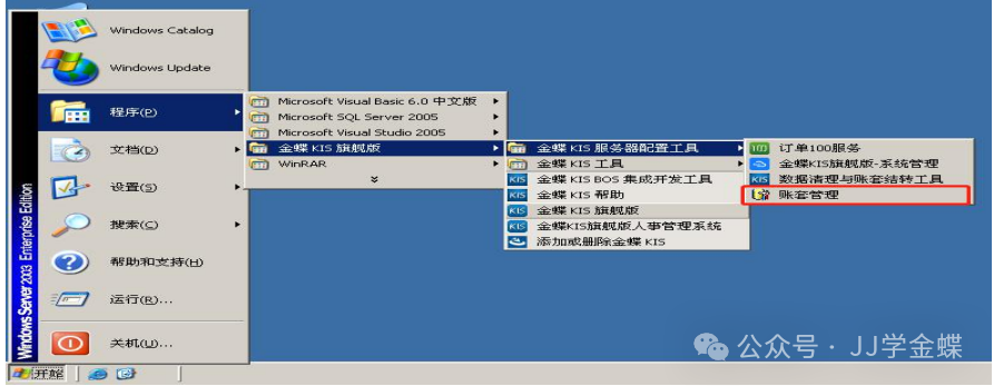1、开始-所有程序-金蝶KIS旗舰版-金蝶KIS服务器配置工具-账套管理