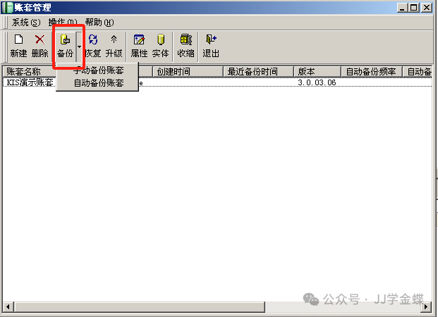 1、金蝶KIS商贸版6.1及先前版本的账套备份: