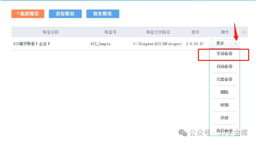 服务器电脑右下角任务栏双击打开【金蝶KIS专业版系统管理】-账套后面-更多-手动备份,如下图所示: