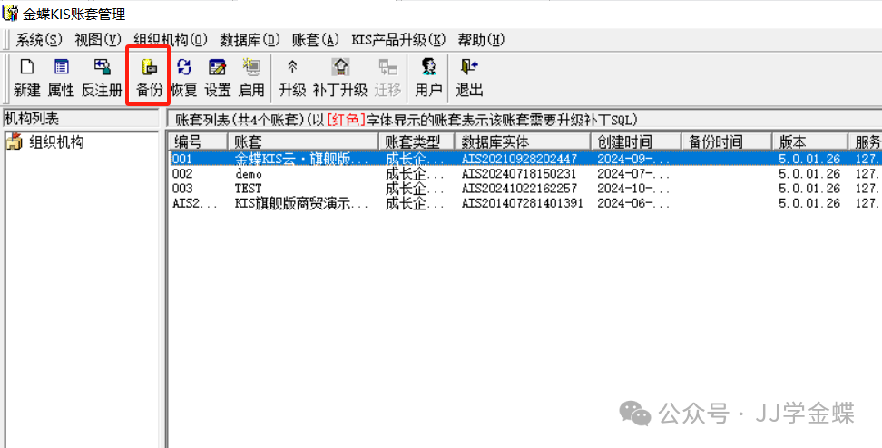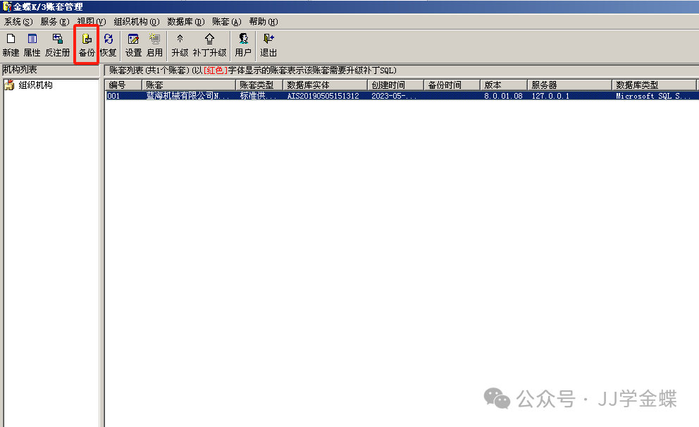 3、账套列表中点中需要备份的账套,点工具栏【备份】