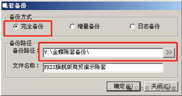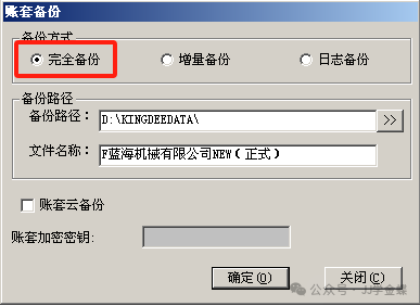 4、选择完全备份和备份路径,录入备份文件名称,确定。