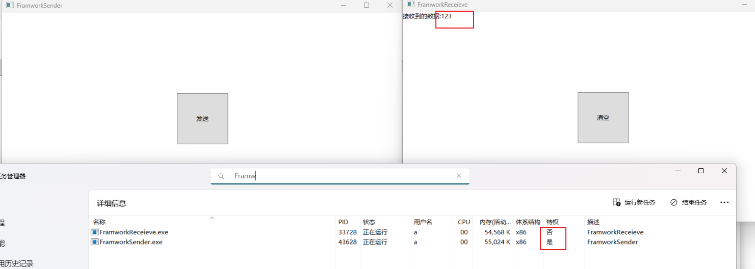 3、发送端是管理员权限,接收端是 普通权限,是可以接受到数据