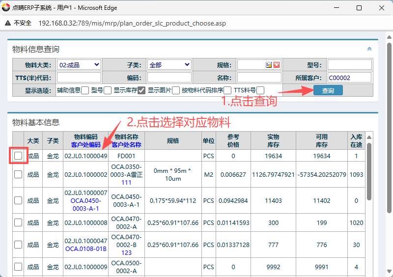 在窗口内点击查询,然后点击选择对应的物料信息