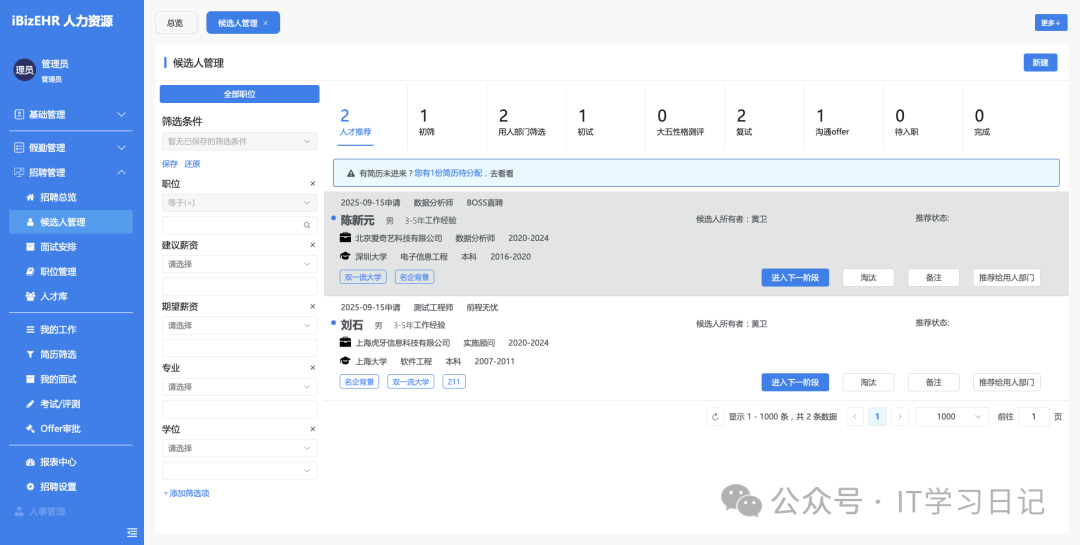 招聘管理:覆盖社招、校招、内推、猎头管理等场景,让HR获得更高效的招聘体验、更便捷的协作体验,让管理者获得招聘数据洞见。让招聘降本增效的同时,树立企业在候选人心目中的专业形象。